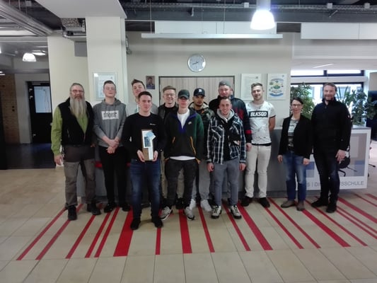 Die Dachdeckerlehrlinge im 3. Ausbildungsjahr staunten nicht schlecht, als am 12.12. JPRS-Schulleiter Nick Szymanski zusammen mit Sandra Betz, Abteilungsleiterin Berufsschule, ihren Unterricht besuchten. Klassenlehrer Roland Weinbrenner war natürlich eingeweiht. Die Schulleitung kam, um einem seiner Berufsschüler zu gratulieren: Tim Nürnberger war Anfang Dezember von der Handwerkskammer Wiesbaden als Lehrling des Monats November ausgezeichnet worden.