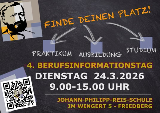 Die Johann-Philipp-Reis-Schule (JPRS) in Friedberg lädt unter dem Motto „Finde deine Möglichkeiten“ alle Interessierten zum Tag der offenen Tür am Samstag ,7.2.2026, von 9.00-15.00 Uhr ein. Für die Besucher wird ein ausgeschilderter Rundgang eingerichtet. Hierfür öffnet die Schule diverse Unterrichtsräume und Werkstätten. Die Gäste können selbst Stationen auswählen und auf diesem Weg die Schulformen und beruflichen Schwerpunkte der JPRS kennenlernen. Im Vorfeld der Veranstaltung wird auf der Schulhomepage www.jprs.de eine Programmübersicht veröffentlicht.