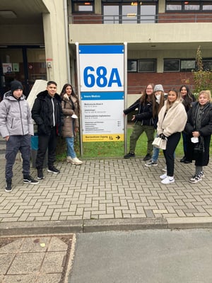 Gemeinsam mit den Sozialarbeiterinnen der Schule Anna Krüger und Daniela Völker wurden die Lernenden mit Informationsmaterial versorgt. Dabei zeigten sie sich offen der Thematik gegenüber. Dementsprechend war das Interesse an einem Ausflug in das Haus 68, der Infektiologie des Universitätsklinikums Frankfurt am Main, groß.