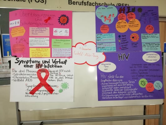 Die erarbeiteten Informationen und Erkenntnisse wurden dann in den Projektgruppen auf selbst gestalteten Plakaten festgehalten, die am 1.12. zum Welt-Aids-Tag im Foyer der Schule im Rahmen eines Infostandes ausgestellt wurden. In den Pausen konnten sich die Schülerinnen und Schüler der JPRS anhand der Plakate über die Thematik informieren. Die am Projekt beteiligten Jugendlichen der Berufsfachschulklassen verteilten Informationsmaterial zu HIV, Aids und diversen sexuell übertragbaren Krankheiten sowie Kondome.