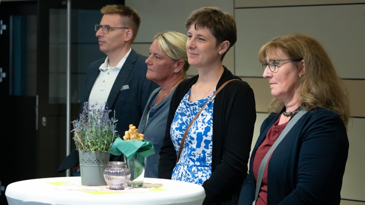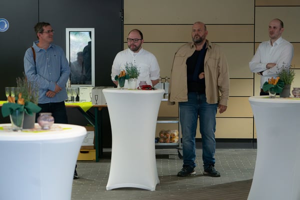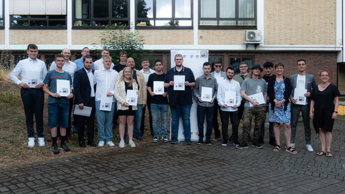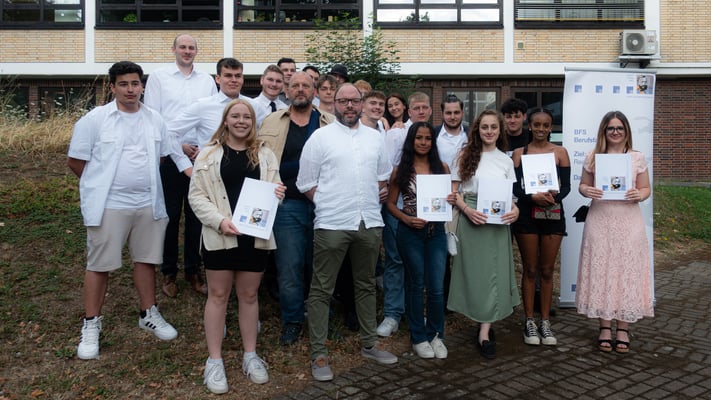 Nach der Übergabe der Zeugnisse bat Abteilungsleiter Mirko Wolf die Schülerinnen und Schüler zum Fototermin mit ihren Lehrerinnen und Lehrern. Anschließend ließen die Absolventen der Berufsfachschule mit ihren Angehörigen und Lehrern den Abend mit netten Gesprächen, Getränken und Knabbereien ausklingen.