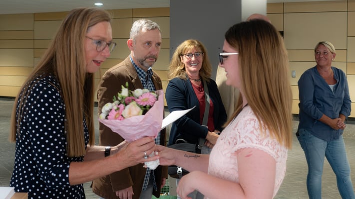 In seiner Rede freute sich Schulleiter Szymanski mit den Absolventen über den erfolgreichen Abschluss der Berufsfachschule. Nun könnten sie neue Wege beschreiten, z.B. einen höheren Schulabschluss anstreben oder eine Berufsausbildung beginnen. Dabei könnten sie die in der Berufsfachschule erworbenen Kompetenzen und berufsvorbereitenden Qualifikationen mit auf ihren neuen Weg nehmen. Herr Szymanski bat die Absolventen, sich anlässlich ihres Abschlusses bei allen zu bedanken, die sie unterstützt haben, und wünschte ihnen viel Erfolg und Glück auf ihrem weiteren Lebensweg.
