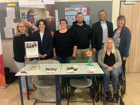 Personen auf dem Gruppenfoto: von links Gabriele Garte, Nuria Hoss, Lisa Jung, Samjuel-Hayden Kraft (alle InkA), Nick Szymanski (Schulleiter JPRS), Julia Maiano (Fachkraft für Inklusion der Stadt Friedberg), Mareike Boehm (Wartbergschule)