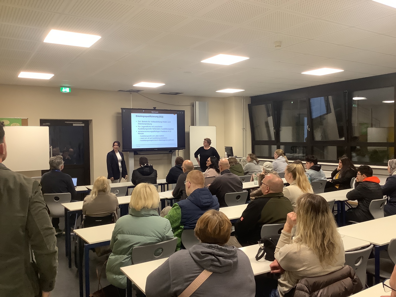 Lisa Jung und Nuria Hoss von InkA beleuchteten in einer Präsentation zum Thema „Übergang von der Schule in den Beruf“ wichtige Aspekte und Angebote rund um das Ende der Schulzeit und den Einstieg ins Berufsleben. Die Angebote haben zum Ziel Menschen mit Behinderungen die Teilhabe auf dem Arbeitsmarkt zu ermöglichen. Im Gespräch betonte Frau Jung, wie wichtig es sei, möglichst viele Leistungsanbieter an einem Ort zu haben, damit die jungen Menschen alle Möglichkeiten kennenlernen und dann eine selbstbestimmte Auswahl treffen können.