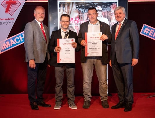 Urkunde vom hessischen Ministerpräsident für die Fleischerlehrlinge an der Johann-Philipp-Reis-Schule in Friedberg Hohe Anerkennung für die Fleischerlehrlinge an der Johann-Philipp-Reis-Schule in Friedberg. Für Ihre Schüler nahmen die Fachlehrer Holger Buss und Dieter Blocher die Urkunde der Qualitätsprüfung des hessischen Fleischerhandwerks persönlich aus den Händen vom hessischen Ministerpräsidenten Volker Bouffier entgegen. Der war eigens nach Korbach gekommen, um im Rahmen des...