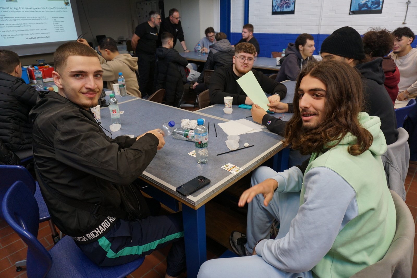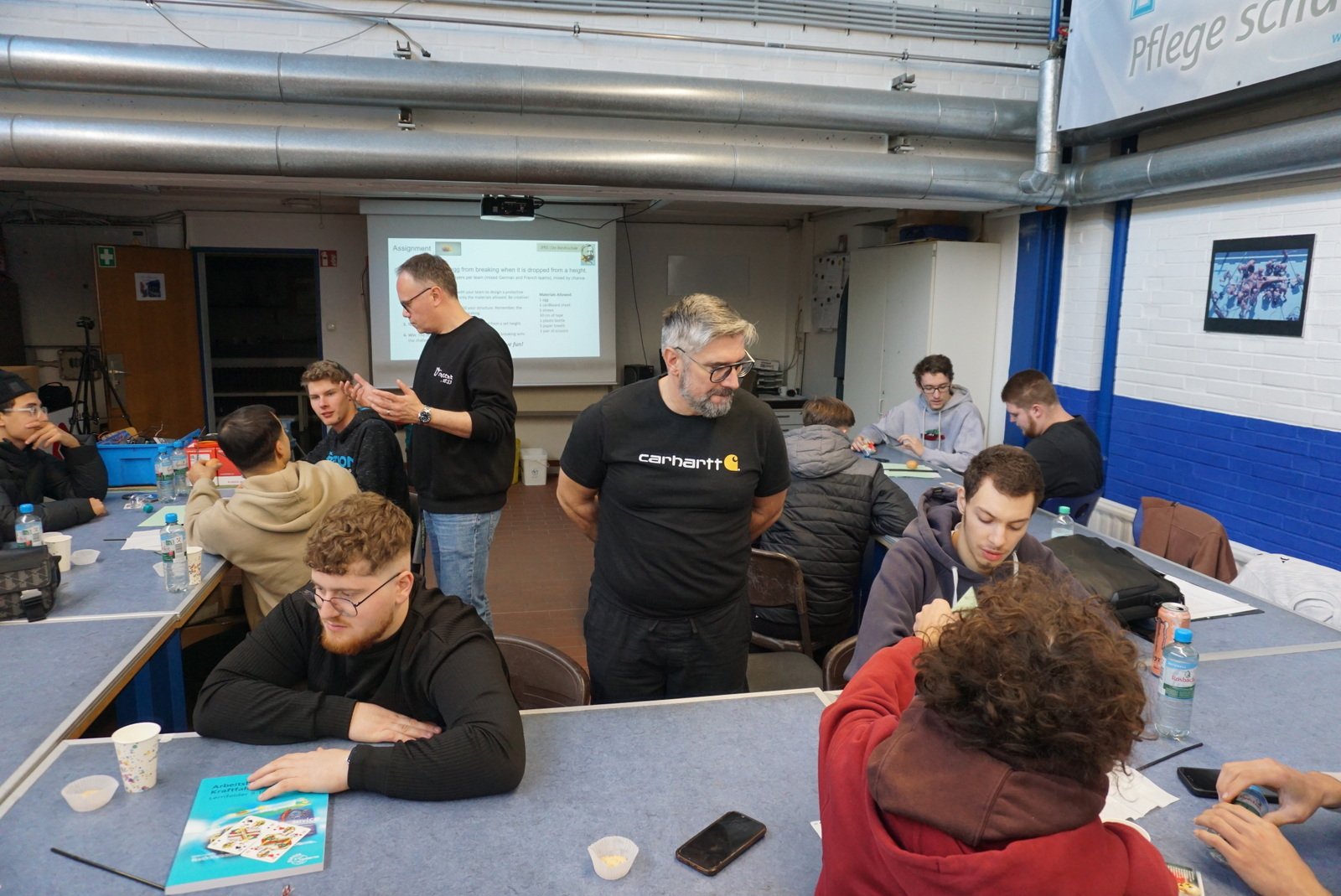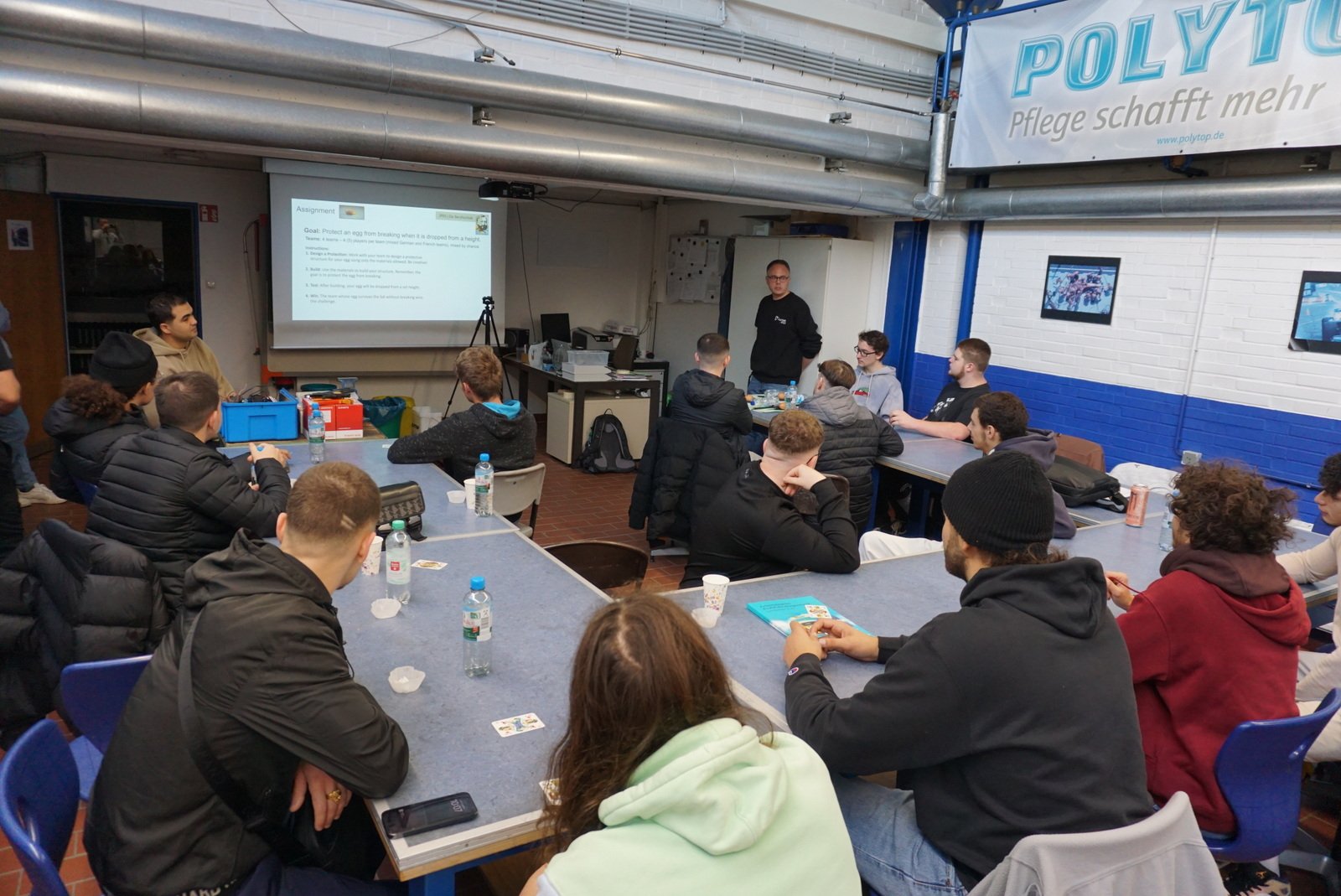 Am Montag begrüßten Schulleiter Nick Szymanski sowie Nico Diehl und Lorenz Nockemann von der KFZ-Abtteilung herzlich die Gäste aus Lyon und führten sie durch die JPRS. In deutsch-französischen Gruppen lernten sich die Schüler über das Spiel „Egg-Drop“ kennen: Aus vorgegebenen Materialien wie z.B. Strohhalme, Tesafilm und Plastikflaschen bauten die Schüler einen Fallschutz für ein Ei. Auf dem Schulhof zeigte sich, welche Schutzvorrichtung die gelungenste war und das Gewinnerteam wurde gefeiert. Nach dem Mittagessen in der Mensa verbrachten die Schüler einen fröhlichen Kegelnachmittag in der Stadthalle Friedberg.
