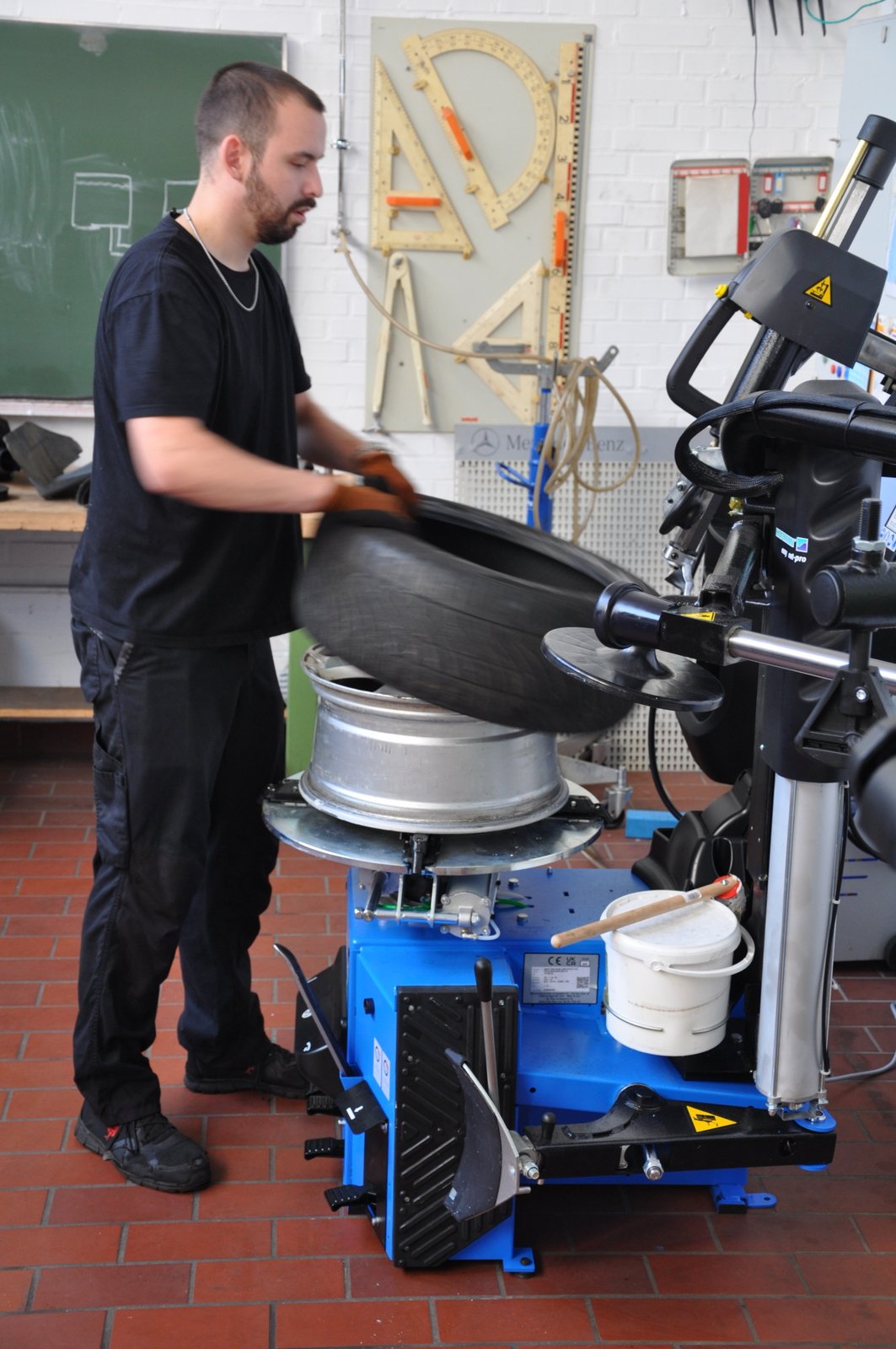 Dann fragte Lehrer Lorenz Nockemann seine Lehrlinge, wer denn als erster die Montiermaschine ausprobieren wolle. Auszubildender Ivan Diodorov erklärte sich bereit und bediente die Maschine sehr versiert. Mit einer ähnlichen Maschine habe er bereits in seinem Ausbildungsbetrieb gearbeitet, so der Kfz-Lehrling. Konzentriert und präzise montierte Ivan den Reifen mithilfe der Maschine in mehreren Arbeitsschritten vom Felgen ab; anschließend zog er den Reifen wieder fachmännisch auf die Felge auf. Das Abnehmen und Aufziehen des Reifens dauerte insgesamt gerade einmal fünf Minuten. Mit einem anerkennenden Nicken quittierten Lehrer Nockemann und die anderen Berufsschüler das gute Ergebnis.