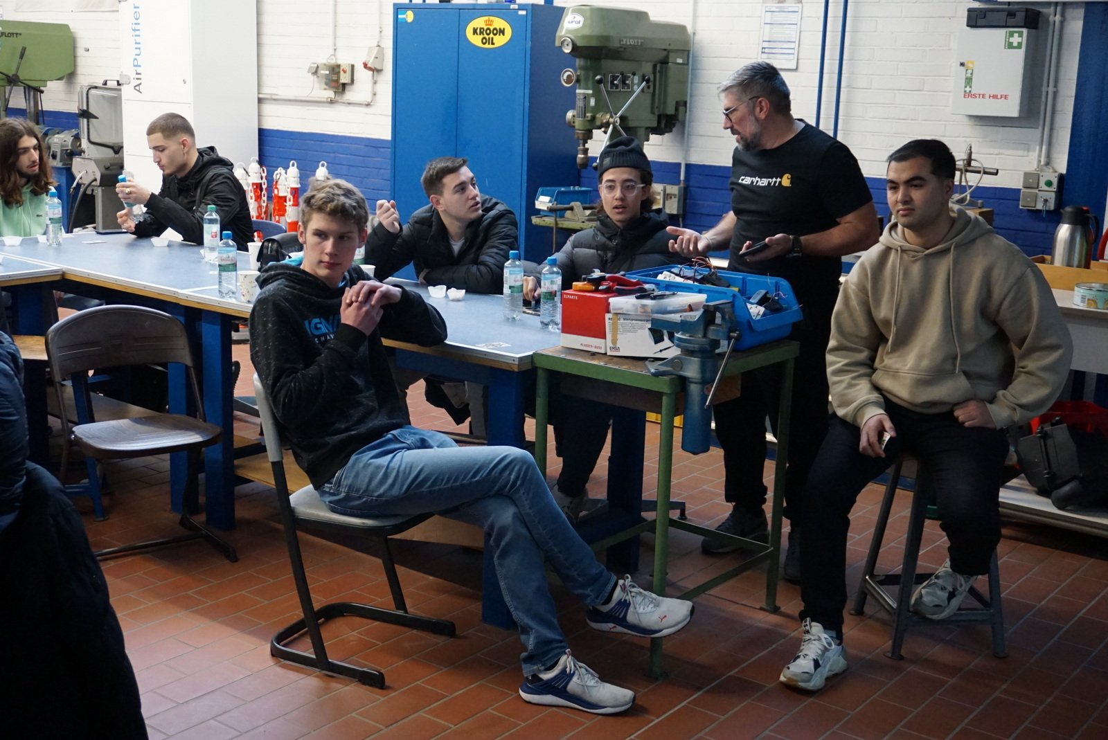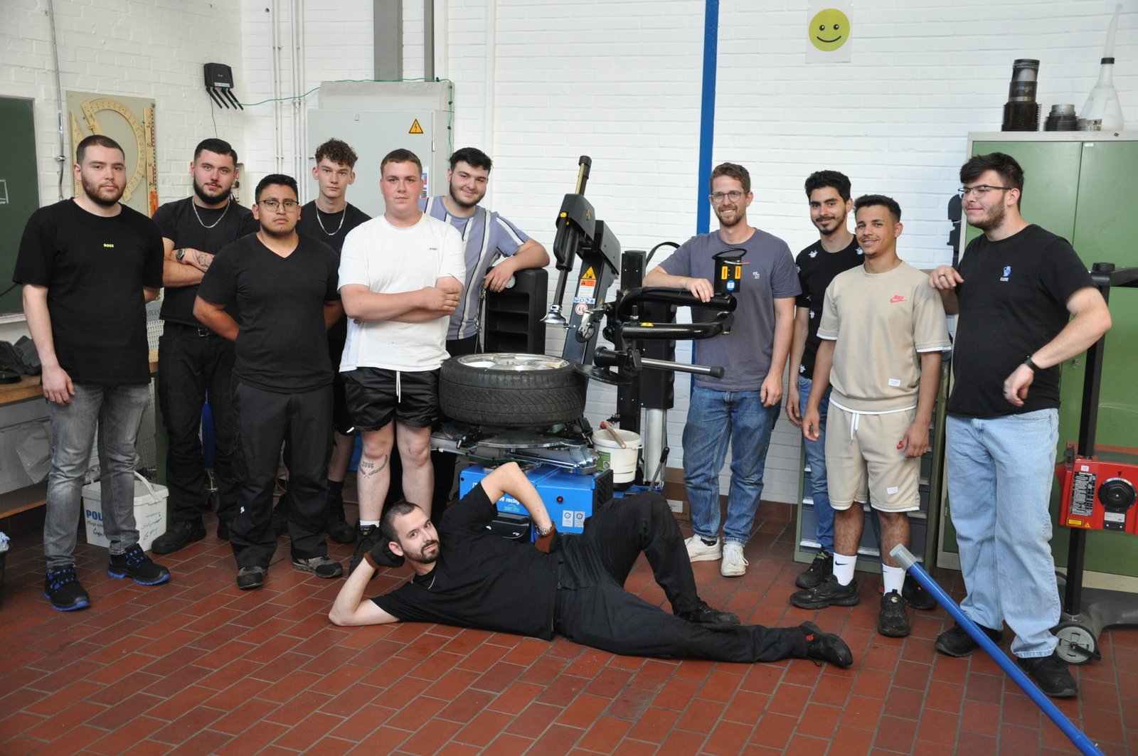 Am 17.6.25 brachten zwei Mitarbeiter der Firma Profi Parts Fahrzeugteile die Reifenmontiermaschine in die Kfz-Werkstatt der Friedberger Berufsschule und montierten sie dort. Sie prüften die Funktionalität und demonstrierten anschließend den angehenden Kfz-Mechatronikern des ersten Ausbildungsjahres die Bedienweise der Maschine.