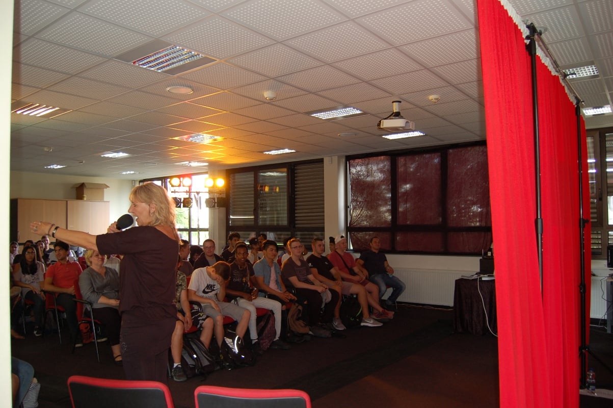 Im Anschluss setzten sich die Jugendlichen mit dem Thema Sucht auseinander, wobei bewusst auf Fachbegriffe verzichtet wurde. Im Vordergrund stand der spielerische Umgang mit dem Thema. Verschiedene Szenen aus dem persönlichen und beruflichen Alltag wurden improvisiert und witzig dargestellt. Mit ihrer Improvisationsfreude gelang es den Darstellern, die Schülerinnen und Schüler auf spielerische Weise mitzureißen.