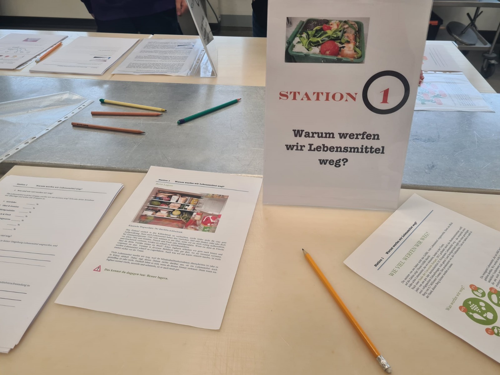 In diesem Jahr wurde der Aktionstag mit dem Thema klimafreundliche Ernährung um eine weitere Attraktion ergänzt. Die Auszubildenden des 3. Lehrjahres der Nahrungsmittelabteilung (Fleischerei und Bäckerei) hatten für die Grundschüler eine informative und eine praktische Station vorbereitet. Zunächst erarbeiteten die Kinder im Themenbereich „Umwelt und Nahrung“ Lösungen zum Einkaufsverhalten sowie zur Lagerung und Resteverwertung. Anschließend stellten die Klimaexperten mit kundiger Unterstützung der Berufsschüler selbst einen Flammkuchen her, den sie dann freudig verspeisten.