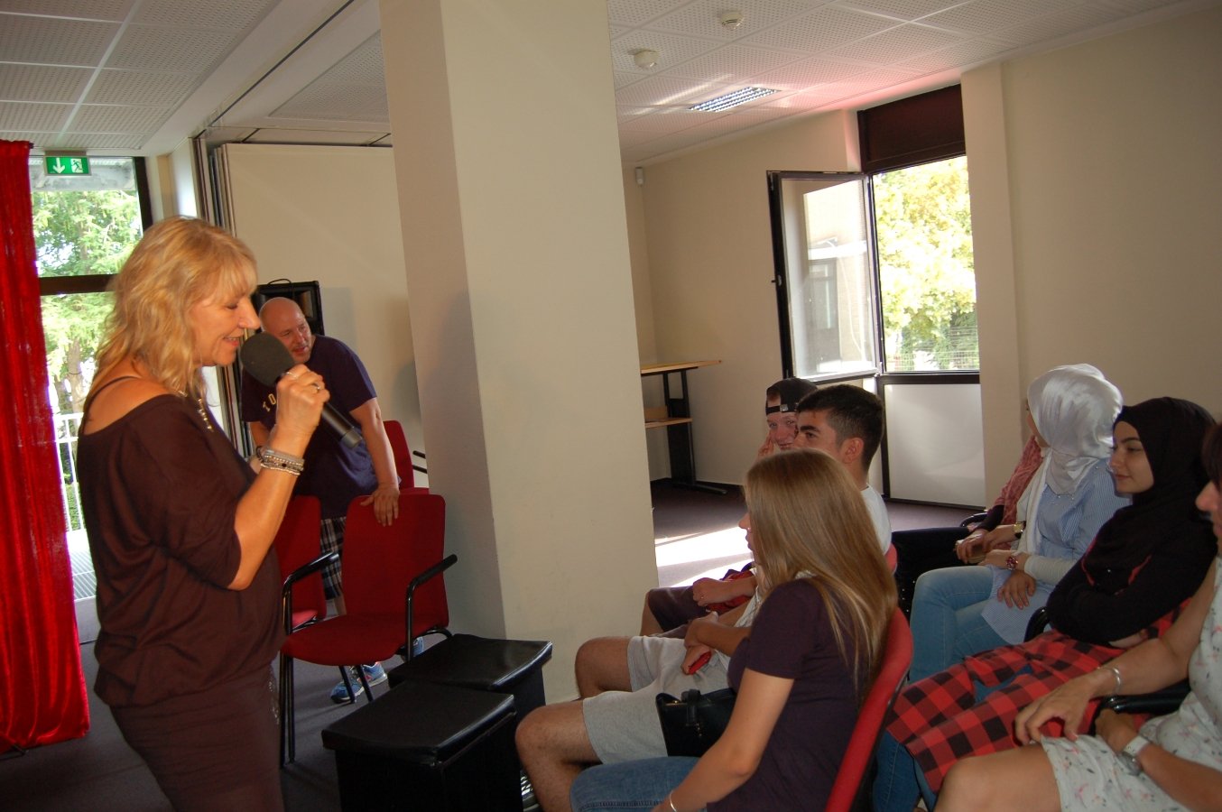 Die Schauspieler boten den Schülerinnen und Schülern der Bildungsgänge zur Berufsvorbereitung (BBV) ein kurzweiliges Improvisationstheater. Spontan bezog das Ensemble die Jugendlichen in die Stücke mit ein. Sehr großen Anklang fand eine Improvisation, bei der die Heranwachsenden auf Zuruf Gefühle darstellten.
