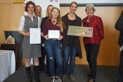 Da die Projekte im Rahmen der Schulgesundheitsgruppe unserer Schule initiiert wurden, nahmen VertreterInnen dieser Gruppe (Stefan Crößmann, Claudia Hahn, Ellen Hegmann, Valeria Peuchert) mit Unterstützung einer Schülerin des Klimaexperten-Projektes (Annchristin Weber) diese besondere Auszeichnung im Haus am Dom in Frankfurt persönlich entgegen.