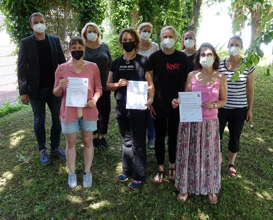 Zur Zertifikatsfeier im Bad Vilbeler Schulamt kamen Schulleiter Nick Szymanski, das Schule & Gesundheits-Team der JPRS mit der Teamleiterin Valeria Peuchert und die Schulsozialarbeiterin Daniela Völker. Sie freuten sich über die wertschätzenden Worte der zuständigen Generalistin des Schulamts, Frau Lucia Niebler, und der Vertreterin der Leitung des Staatlichen Schulamts, Frau Christine Stanzel.