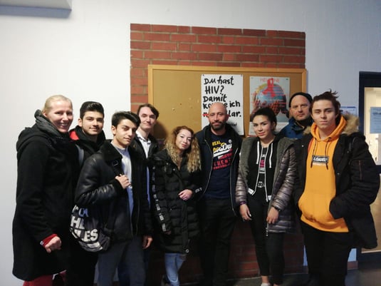 Stationsleiter Fleckenstein beantwortete geduldig und sensibel die Fragen der Jugendlichen. Erschreckend war seine Aussage, dass durch die gute medikamentöse Behandlung der AIDS-Erkrankung (sog. antiretrovirale Therapie) die Prävention nicht mehr greift. Die Zahlen der jährlichen Neuinfektionen würden nach seiner Aussage wieder steigen. Verbessert habe sich, dass HIV-Erkrankte vor Jahren noch zwischen 15-30 Tabletten pro Tag einnehmen mussten, heute sei es „nur“ noch eine Tablette pro Tag. Das Gespräch zwischen Herrn Fleckenstein und der Schülergruppe machte auch deutlich, dass HIV und AIDS Themen sind, die uns alle betreffen, insbesondere aber auch heranwachsende Schülerinnen und Schüler. Mit ihren gut vorbereiteten Fragen zeigten die JPRS-Schüler, dass sie sich interessiert, diskret und respektvoll mit dem Thema auseinandergesetzt hatten.