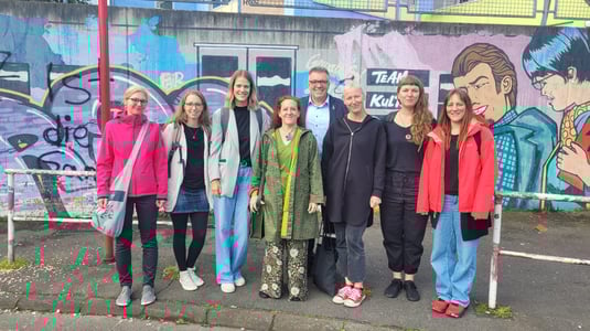Über das Engagement in der JPRS hinaus informiert sich das Schule & Gesundheit-Team regelmäßig darüber, wie andere Schulen das Thema der Gesundheitsförderung gestalten. Gerade mit Blick auf Schule und Gesundheit war der Besuch der Richtsberg-Gesamtschule in Marburg am 28.5.24 die Reise wert. Der stellvertretende Schulleiter René Norwig begrüßte herzlich die Mitgliederinnen und Mitglieder der Arbeitsgruppe aus Friedberg: die Teamleiterin Valeria Peuchert sowie Hilde Sturm, Eileen Jost, Tina Fuest, Rika Pauli, Daniela Völker, Anna Krüger und Holger Buss.
