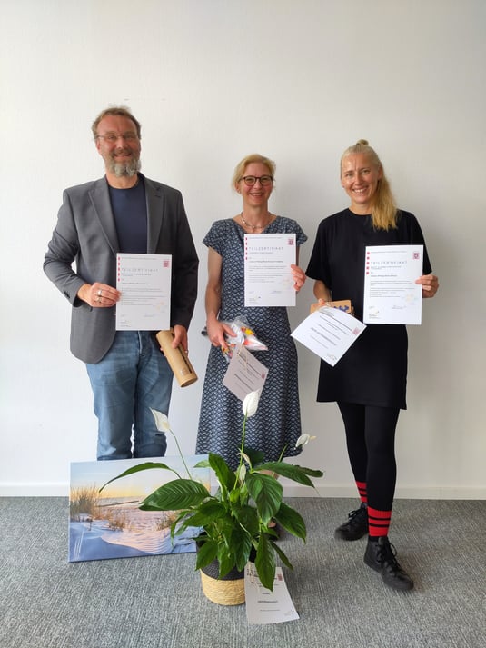 Darüber hinaus durften die vom Schulamt geehrten Besucherinnen und Besucher aus Friedberg passend ausgewählte Geschenke in Empfang nehmen, die optimal zu den erreichten Qualifikationen passten und über die sich alle sehr freuten: Diabolo und Jonglierbälle für Bewegung in den Pausen, ein Bild der Küste mit Sonnenaufgang und eine schöne Pflanze für das Wohlbefinden der Lehrkräfte sowie drei Sets mit Kommunikationskarten für das kreative Miteinander.