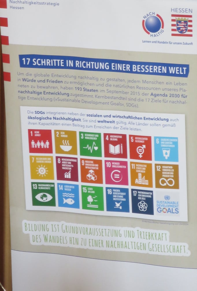 Staatssekretärin Dr. Beatrix Tappeser aus dem Umweltministerium und Staatssekretär Dr. Manuel Lösel aus dem Kultusministerium als offizielle Vertreter des Projektes „Umweltschule – Lernen und Handeln für unsere Zukunft“, sowie der Oberbürgermeister der Stadt Frankfurt, Peter Feldmann, verliehen unserer Schule sowie 100 weiteren engagierten Schulen am 26.Oktober 2017 in einer feierlichen und groß angelegten Veranstaltung den Umweltschul-Preis in Form einer Urkunde und einem ansprechenden Schild, das schon den Platz in unserem Foyer gefunden hat.