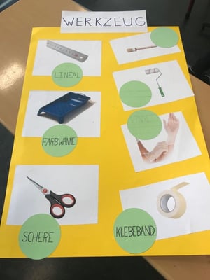 Auf Plakaten werden Arbeitsschritte und Werkzeuge dargestellt.