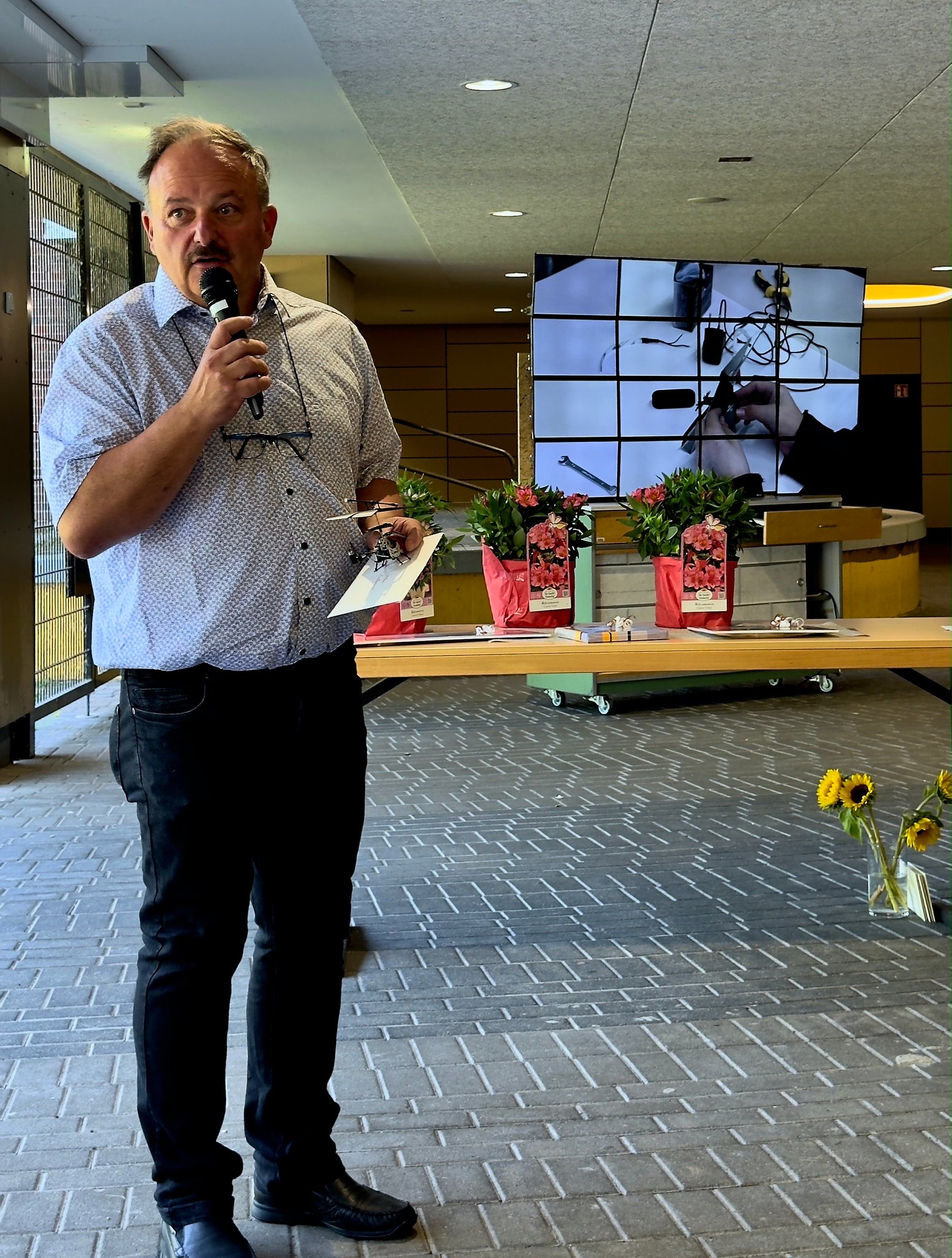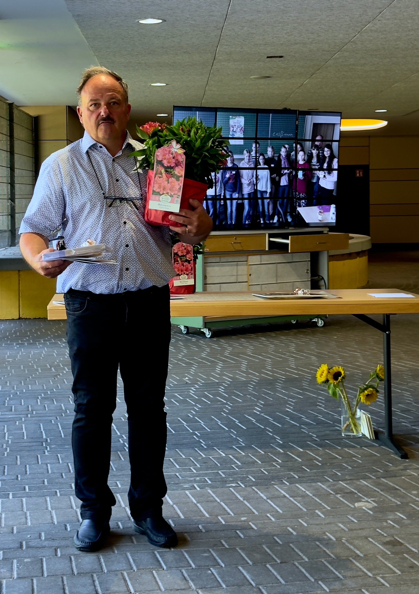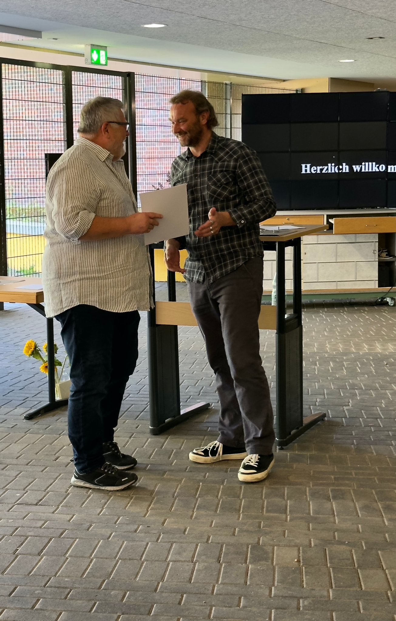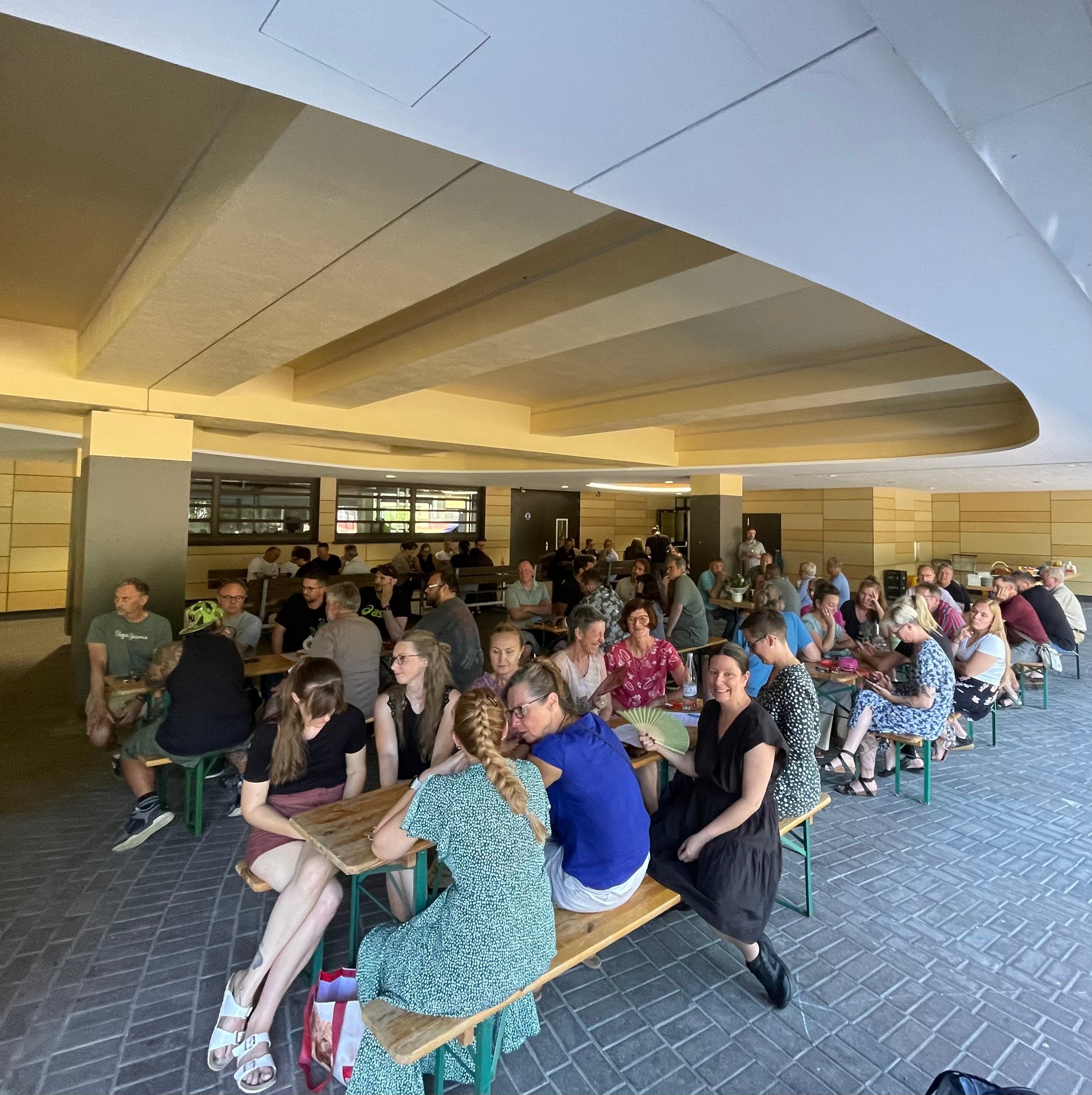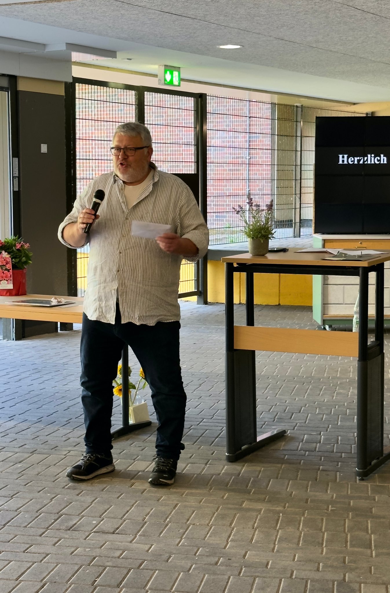 Am 1.7.25 traf sich die Schulgemeinde der Johann-Philipp-Reis-Schule zur Verabschiedungskonferenz auf dem unteren Schulhof. Anlass war die Verabschiedung des Kollegen Horst-Jürgen Wohlgemuth in den Ruhestand, des Kollegen Michel Schwob wegen Versetzung an eine andere Schule und des Kollegen Frederik Weiß aus der Schulleitung. Weiterhin wurde Inge Geller für ihr 25-jähriges Jubiläum als Schulsekretärin geehrt. Die Fotos zeigen Eindrücke von der schönen Abschiedsfeier auf dem Schulhof. Schulleiter Nick Szymanski, Personalratsvorsitzende Nathalie Reinke und viele Kolleginnen und Kollegen hielten Dankes- und Abschiedsreden. Sie würdigten das jahrelange Engagement der Geehrten für ihre Schule und überreichten ihnen als Dankeschön Blumensträuße und Geschenke. Diese bedankten sich herzlich beim Kollegium, das zahlreich erschienen war. Im Anschluss folgte ein geselliges Beisammensein mit anregenden Gesprächen bis in den späten Nachmittag. Für die Verköstigung sorgten die zukünftigen Ruheständler mit Getränken und leckeren Salaten. Holger Buss von der schuleigenen Fleischerei verwöhnte die Kolleginnen und Kollegen mit Steaks und Würstchen vom Grill.